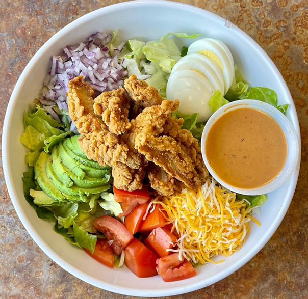 - SIN CITY SALAD: House-sliced chicken cutlets on a bed of crisp Romaine lettuce, shredded cheddar/Jack cheese, crispy summer corn, crispy bacon, and sweet red onion.