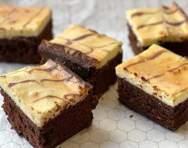 CHEESECAKE BROWNIE: Ghiradelli double chocolate brownie with chocolate chips, topped with a layer of creamy New York style cheesecake.