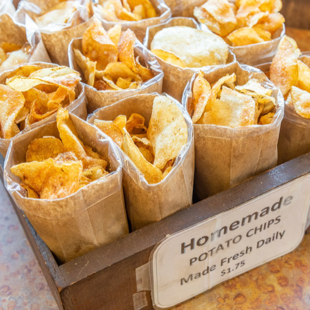 Freshly cut homemade potato chips, always crispy and delicious, are carved and freshly made every day.